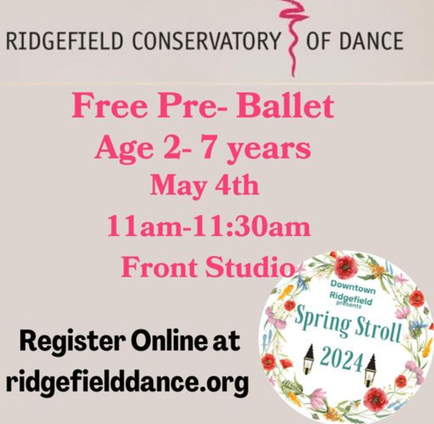 Ridgefield merchants and small businesses will offer an array of activities during the stroll. Ridgefield Conservatory of Dance (RCD) will be hosting FREE pre-ballet class for children aged 2-7 years in their front studio the morning of our 2024 Spring Stroll!